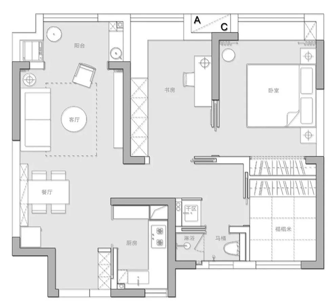 圖2.戶型改造:1、我們將利用鞋柜的柜體和削薄墻體,利用第一扇內(nèi)嵌門,能保證過道的寬度,鞋柜的正常深度和廚房的空間利用最大化;2、我們利用第二扇內(nèi)嵌門,將衛(wèi)生間改造成干濕分離,原本以為淋浴空間比較小,現(xiàn)場的實(shí)際感受也比較舒適;3、我們利用第三扇內(nèi)嵌門,將北面的小房間打造成榻榻米房,業(yè)主說冬天的時(shí)候坐在榻榻米上泡腳就近衛(wèi)生間應(yīng)該是一件很享受的事情;4、我們利用第四扇內(nèi)嵌門,打造了小兩口的書房和臥室的套間;5、我們利用第五扇內(nèi)嵌門,打造了臥室和書房可開可合的空間。
