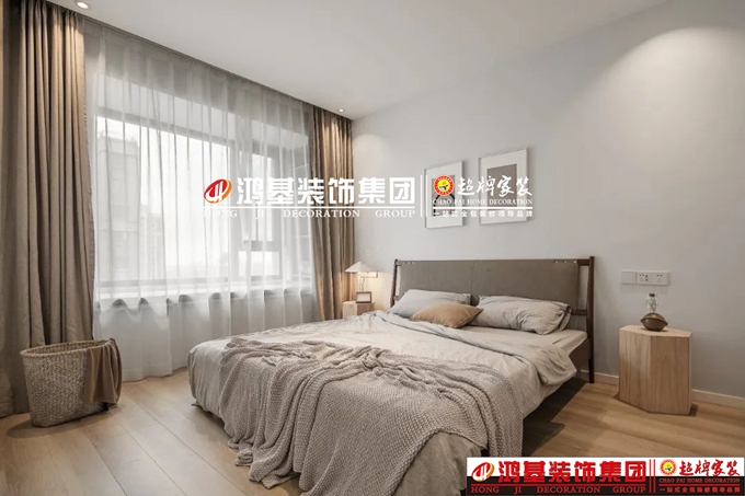 主臥,極簡的墻頂面設(shè)計(jì)搭配原木地板,裝飾畫修飾床背景,灰褐色大床搭配卡其窗簾,低飽和的色彩制造舒眠環(huán)境。